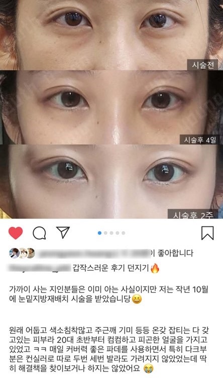 감독님이 가라앉은 모습에 대해 말씀하신 것을 알 것 같아요. 원래의 지방이 사라져서인지 지방이 가득 차 있던 부위가 함몰된 것입니다. 그래서 굉장히 퉁퉁해 보이는데요. 내가 이런 일을 했는지 모르는 어머니가 오랜만에 나를 보더니 요즘 피곤하냐고 물었다. 그래서 지방이식까지 하기도 합니다. 이때 눈 밑 부분이 부작용처럼 보이기는 정말 싫었는데 부작용이었는데 원장님께서 미리 알려주셔서 괜찮을 줄 알았습니다.
