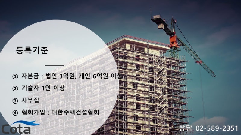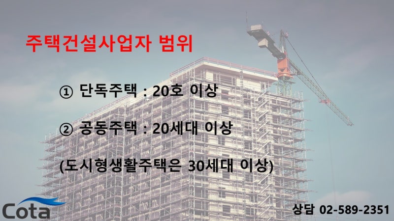 주택건설사업에는 두 가지 유형이 있습니다. 1) 분양주택건설: 일정 요건을 충족하는 자에게 사업계획 승인을 받아 20세대 이상의 주택을 건설하는 사업입니다. 2) 임대주택건설: 5년 이상 임대 후 판매할 목적으로 임대주택법에 따라 주택을 건설하는 사업입니다. 오늘은 주택건설사업 허가를 받기 위해 충족해야 하는 등록 요건에 대해 알아보겠습니다. 먼저 등록 기준을 충족해야 합니다. 자본금, 기술자, 사무소의 세 가지 기준만 충족하면 됩니다. 일반건설이나 전문건설 등 다른 법률에 따라 허가를 받은 신청자는 관련 법률에 따른 법정 등록 기준과는 별도로 주택건설사업 등록 기준(자본금, 기술자, 사무소)을 충족해야 합니다.