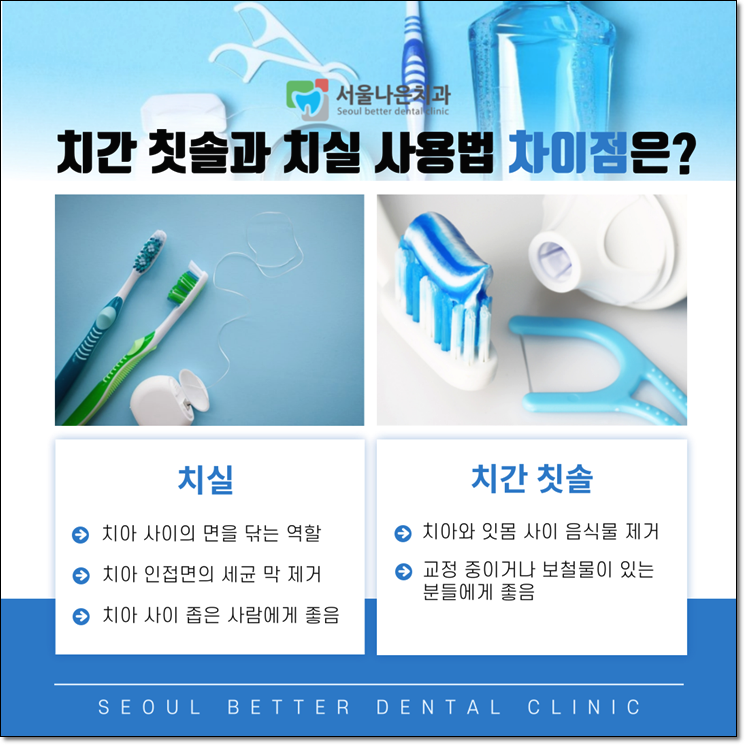안녕하세요! 방문하시는 많은 분들이 충치와 잇몸질환을 걱정하고 계십니다. 이러한 질병의 대부분은 잘못된 양치질이나 잘못된 구강 위생 관리로 인해 발생합니다. 오늘은 구강 건강에 꼭 필요한 치간칫솔과 치실 사용법에 대해 알려드리겠습니다. . 치간 칫솔과 치실을 사용해야 하는 이유