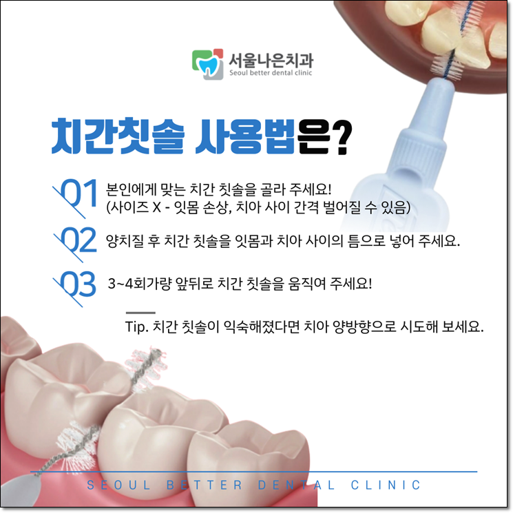 1. 적절한 크기의 치간칫솔을 사용하십시오.