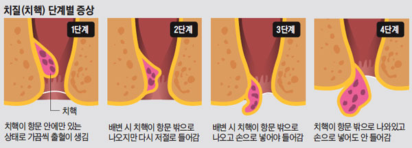 그리고 치질의 증상에는 독특한 단계가 있습니다. 1단계: 가끔 출혈이 발생합니다. 2단계: 덩어리가 있으나 저절로 들어갑니다. 3단계: 덩어리가 나옵니다. 손으로 밀어 넣으면 들어갑니다. 4단계: 항상 덩어리가 나옵니다 밀어 넣어도 들어가지 않습니다.