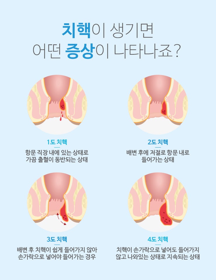 치질 증상이 있나요? 먼저 치질의 증상을 정리하자면… 1) 탈출된 치질이 진행되면서 배변 시 항문 밖으로 빠져나오게 됩니다. 탈출은 (치질의 점진적 분류)과 같이 1~4까지 진행됩니다. 초기에는 저절로 항문으로 들어가지만, 병이 진행됨에 따라 손으로 밀어 넣어야 하게 되고 결국에는 불가능하게 됩니다. 손으로 넣어보세요. 또한, 배변을 하지 않더라도 재채기, 기침, 보행 시, 가스 배출 시, 물건 들 때 항문이 빠져 불편함을 유발할 수 있습니다. 2) 배변시 출혈 치질의 가장 흔한 증상입니다. 피가 대변이나 화장지에 묻어 있거나, 조금 심해지면 피가 뚝뚝 떨어지게 됩니다. 또한, 치질이 더 진행되면 일상생활 중에 출혈이 생기기도 하고, 팬티나 바지에 피가 배어들기도 합니다. 특히 점액출혈이나 검붉은색 출혈은 직장암의 증상일 수 있으므로 반드시 전문의와의 상담이 필요합니다. 3) 항문 가려움증탈출된 항문 상피 점막에서 분비되는 점액이 약해진 항문 주변의 피부를 자극합니다. 4) 항문통증 내치핵(암성 치질)은 항문 내부에서 발생하며 대개 통증이 없습니다.