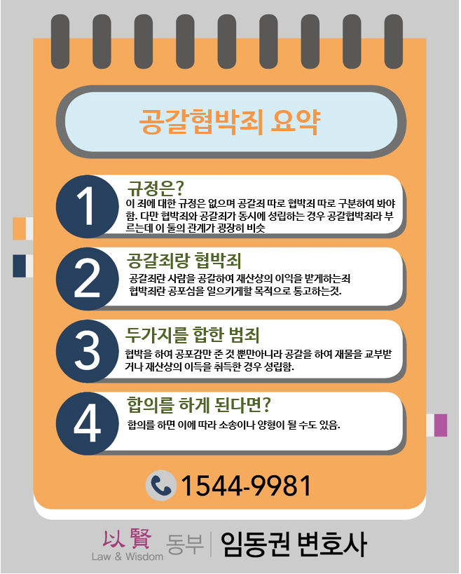 형법 제350조에 규정된 공갈죄에서 공갈로 재물을 수수하거나 취득한 자는 10년 이하의 징역 또는 2천만원 이하의 벌금에 처해질 수 있다. “갈취”는 재산 또는 재산상의 이점을 제공하겠다는 위협을 의미합니다. 따라서 협박을 통해 금품을 갈취한 경우 형법상 ‘협박’이 아닌 ‘갈취’로 처벌된다. 공갈죄 성립요건은 ①상대방이 공갈로 공포감을 갖고 있을 것 ②재물을 양도·처분하는 행위가 있고 ①과 ②사이에 인과관계가 있을 것 D 기자가 신분을 확인하고 돈을 갈취한 사건이 있었다. D씨는 건설현장에서 자신의 요구를 들어주지 않는 것처럼 비방 글을 쓰거나 민원을 제기하는 방식으로 현금을 받았다. 이 사건에서 D씨의 행위는 피해자의 재산 처분을 초래한 것으로 판단되어 징역 3개월, 보호관찰 1년 및 사회봉사 40시간을 선고받았다.