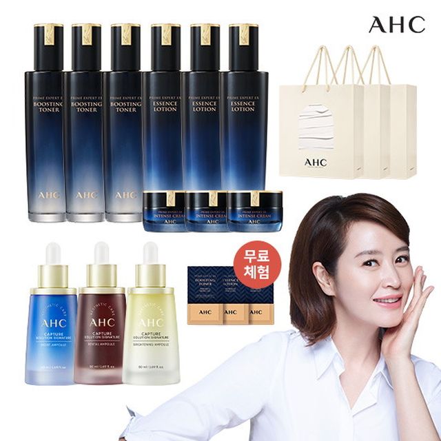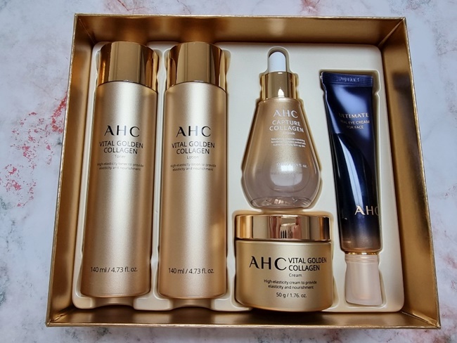 롯데홈쇼핑에서 방송된 AHC 로지 골드 기본 세트에는 에센스 3병+로션 3병+크림 3병과 골드 앰플 제품 2병+샘플이 포함되어 있으며 129,000원에 판매되었다.